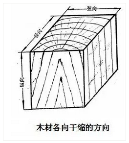 由于木材为非匀质材料,其胀缩变形各向不同,其中以弦向最大,径向次之,纵向 (即顺纤维方向)最小。