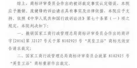 9月8日,英皇卫浴在公众号发文称,北京知识产权法院于2017年9月1日作出行政判决((2016)京73行初2825号),台州市路桥美豹洁具厂商标对于佛山市高明英皇卫浴有限公司构成侵权,并责令国家工商行政管理总局商标评审委员会重新作出裁定。