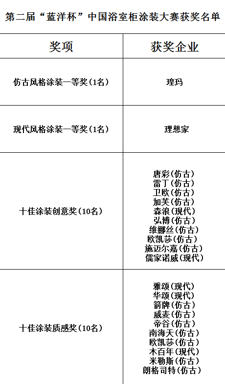 2017年12月15日,由中国建材市场协会卫浴分会、佛山市卫浴洁具行业协会、佛山市卫浴洁具行业协会浴室柜专委会(浴室柜联盟)联合主办、广东蓝洋科技有限公司承办,中洁网协办的2018佛山浴室柜联盟年会暨第二届“蓝洋杯”浴室柜涂装大赛总决赛在佛山富林朗月酒店举行。